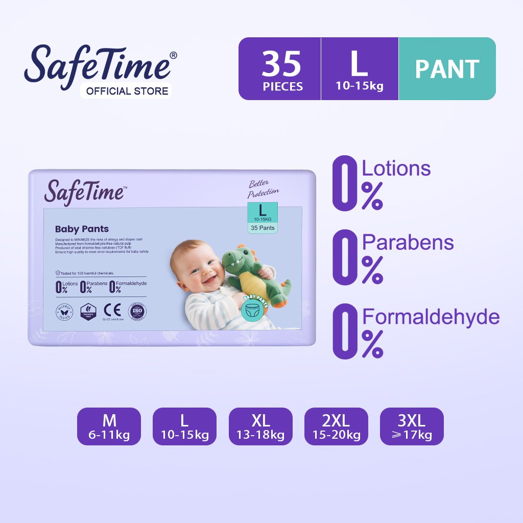 Safetime L Size Pull-Up Pants, easy to put on and take off for energetic babies (10-15kg). Equipped with super absorbent core that achieves 12-hour long-lasting dryness. Hypoallergenic and soft material provides gentle safe protection, avoiding red buttocks. Upgraded leak-proof side guards prevent leakage, suitable for daily active use.